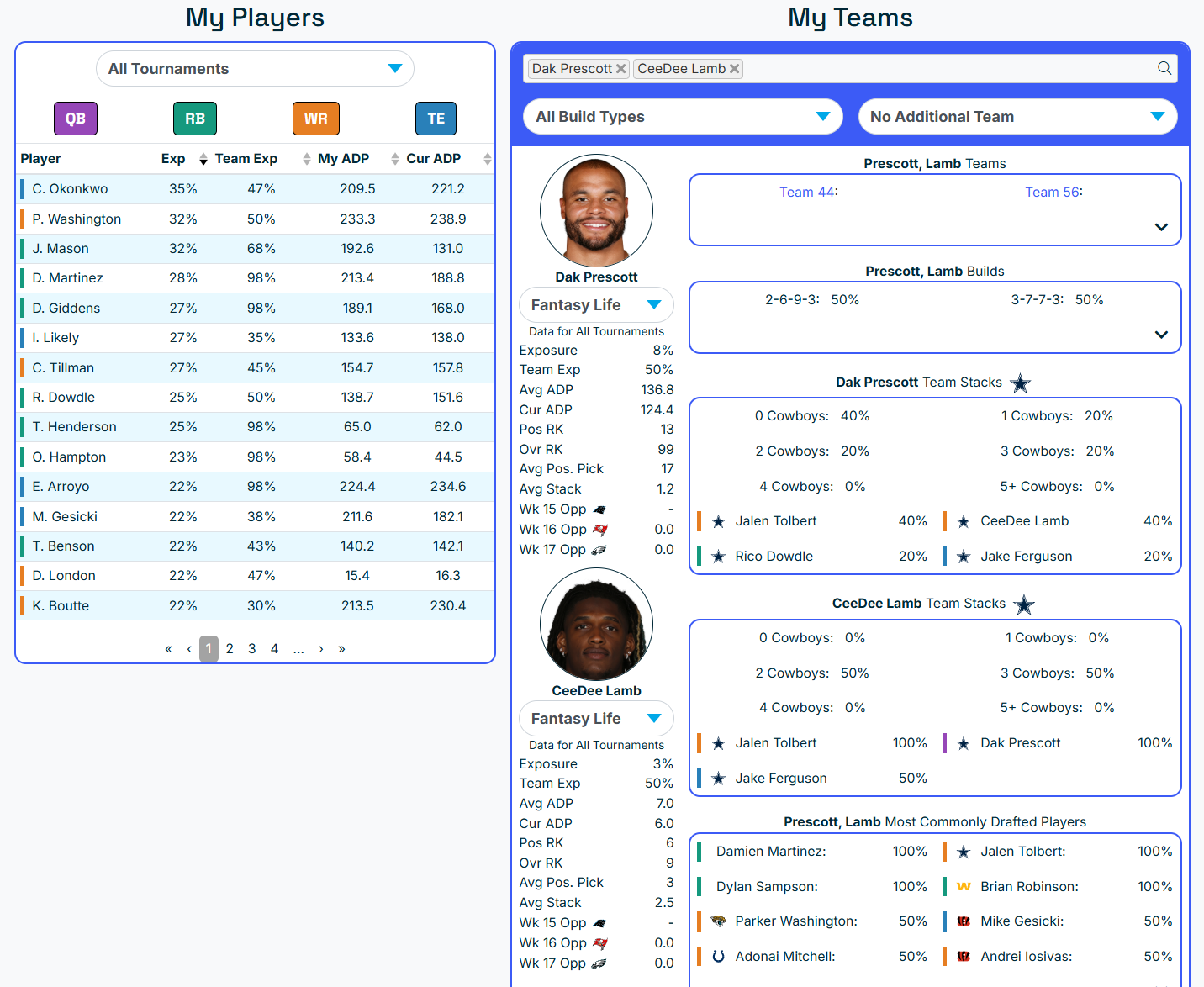 The Best Ball Hub also allows you to track your team exposure, your team stack %, your correlations for the fantasy playoffs, AND your most common player combinations.