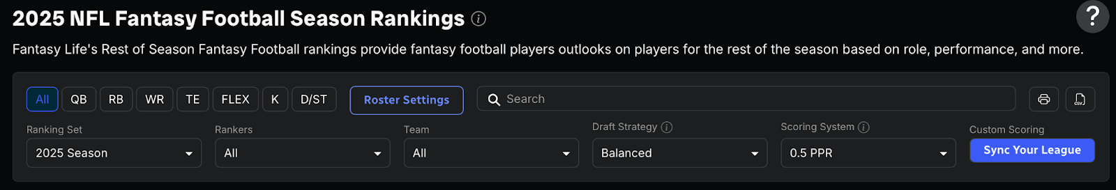 The biggest benefit of our new and improved Rankings Hub is the fact that it has the ability to support nearly any format imaginable. Have custom league settings that drastically alter how and when you draft specific players? You can sync your league settings or create custom settings to have our rankings tailor specifically to your league(s) by clicking the Sync Your League button on the right side of the ranking, and linking your account from the applicable site!